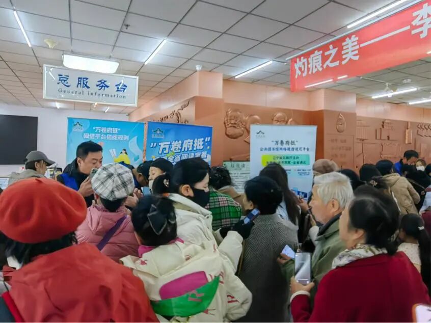 与此同时,图书馆大厅内的万卷府抵推广现场早已人头攒动。读者们纷纷驻足在宣传展位前,工作人员忙碌地为大家介绍活动信息、协助办理扫码抽奖,现场气氛十分热烈。